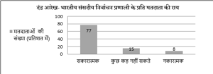 उपरोक्त दंड आरेख से यह ज्ञात हो रहा है कि प्राप्त प्रतिदर्श में 77 प्रतिशत का भारतीय निर्वाचन प्रणाली के प्रति सकारात्मक राय हैं व नकरात्मक के प्रति केवल 8 प्रतिशत ही राय हैं। वहीं इस सवाल पर 15 प्रतिशत मतदाता अपने राय को लेकर स्पष्ट नहीं है। प्राप्त आकड़ों से यह स्पष्ट होता है कि वे भारतीय लोकतंत्र में विश्वास रखते हैं।